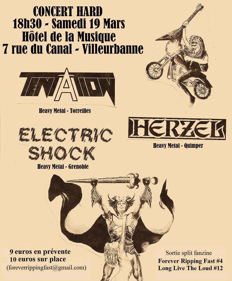 Le samedi 19 mars 2016 à partir de 18h30 à "L'Hôtel de la musique" (7 rue du Canal, 69100) à Villeurbanne, allez soutenir les groupes TENTATION, HERZEL et ELECTRIC SHOCK. Le prix d'entrée sera de 10 euros.