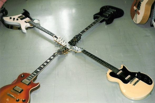 look cuir, type Judas Priest. Avec de magnifiques Guitares, des Gibsons, pour