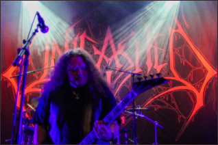 La lumière s'éteint mais le public reste. Le chanteur-bassiste revient, corne à la main, boit un coup et balance le reste du contenu dans la foule compacte... "One more ? One more ? Are you ready ? Death Metal... Death Metal...". Le public exulte. "Death Metal Victory sera le titre apothéotique qui concluera ce concert des plus épiques. L'osmose entre la scène et la salle est perceptible surtout quand l'auditoire reprend le refrain. Johnny joue avec lui, le séparant en deux . A gauche, on crie Death et à droite Metal. "Merci beaucoup, thank you !". Unleashed serre des pognes et s'éclipse définitivement.