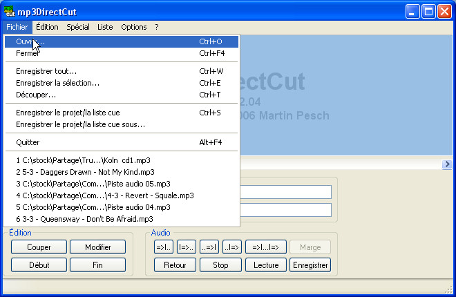 1) Lancez MP3 Direct Cut. Au menu déroulant "Fichier/Ouvrir" sélectionnez