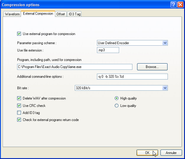 external program for compression" puis mettez les paramètres tels qu'ils apparaissent ci dessous :